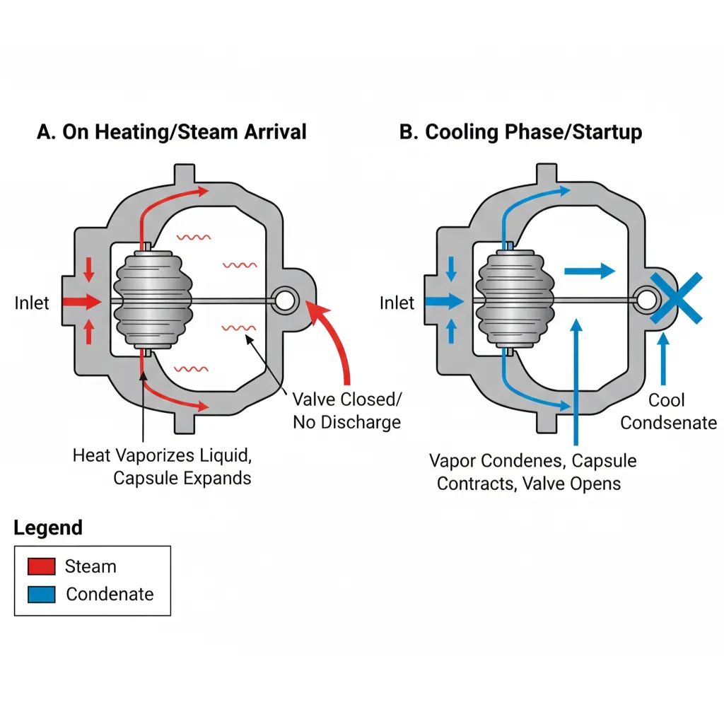 • As hot condensate surrounds the capsule, the internal liquid vaporizes, expanding the capsule and closing the valve.