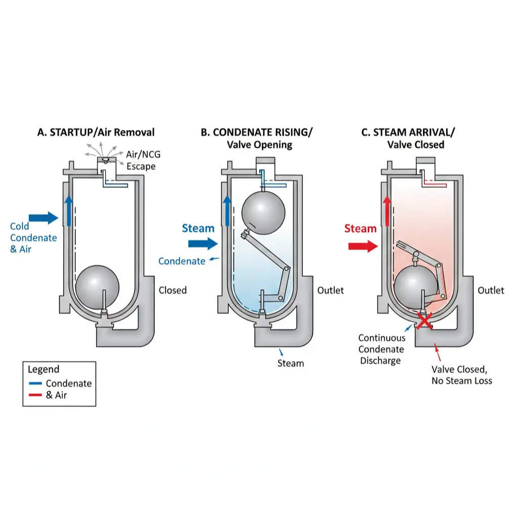 • As condensate enters, the float rises due to buoyancy, opening the main valve to discharge condensate.