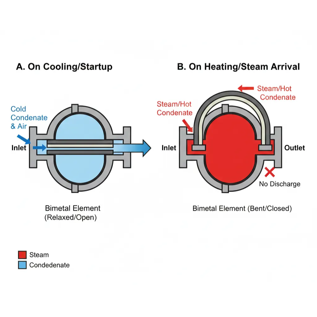 • As cooler condensate enters, temperature drops and the bimetal strip begins to straighten.