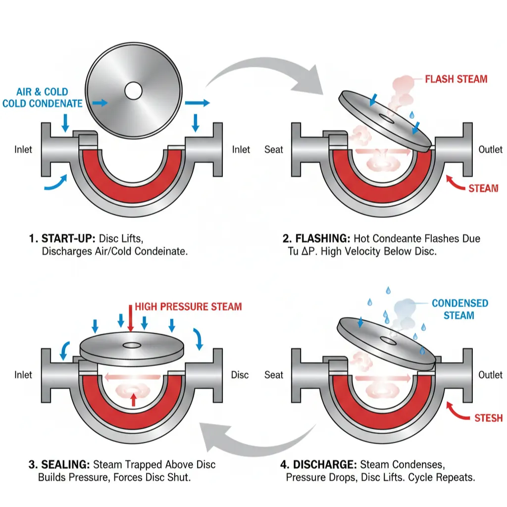 • Once the flash steam above the disc condenses, pressure beneath lifts the disc again, enabling condensate to discharge.