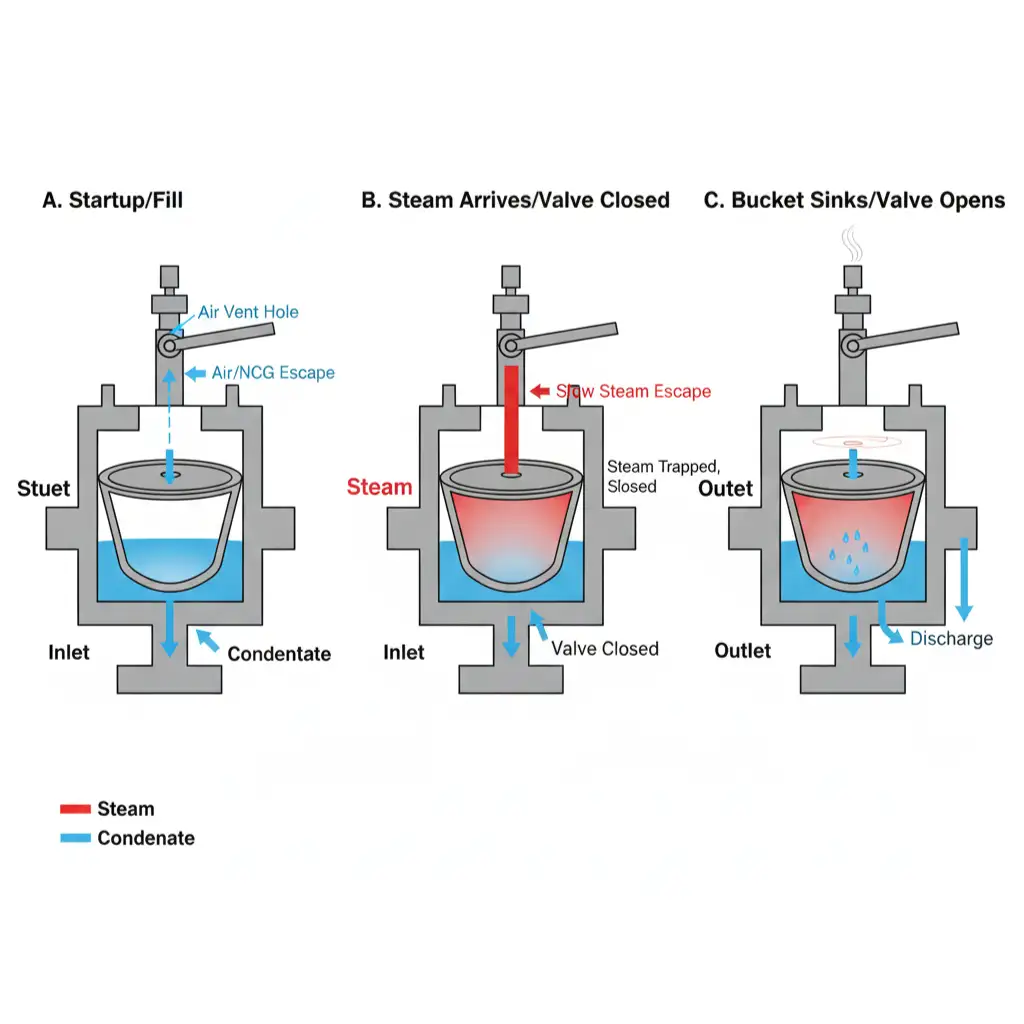 • After the steam inside the bucket condenses or escapes through the vent hole, the bucket drops, reopening the valve for condensate flow.