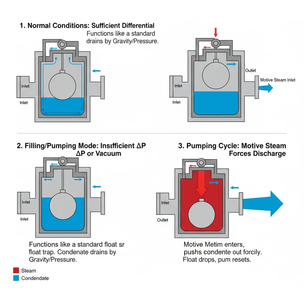 • Motive steam enters and forcibly pumps out the condensate.